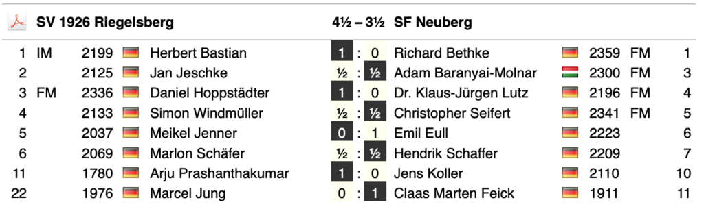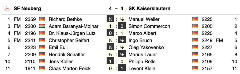 Nun konnten wir glücklicherweise aufholen. Richard hielt seine Schwarzpartie remis. Dann konnten Adam und Jens zwei wichtige Siege beisteuern. Beim Stand von 3,5:3,5 nahm Emil dann das in Zeitnot erfolgte Remisangebot seines Gegners an – auch in dieser Partie war etwas Glück dabei gewesen. Mit dem 4:4-Unentschieden hatten wir aber eigentlich den Grundstein für den Klassenerhalt gelegt, da Worms erwartbar in Wolfhagen verlor.