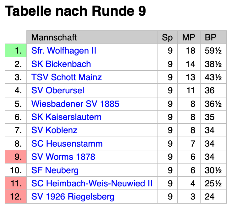 Noch nicht eingerechnet ist dabei das Nachholspiel von Klaus-Jürgen gegen Wiesbaden, das aufgrund des erfolgreichen Protests der Wiesbadener gegen die Schiedsrichterentscheidung noch nötig werden wird. Da es dort aber aktuell 3,5:3,5 steht und Klaus-Jürgen mit Schwarz gegen einen IM mit fast 2600er-Leistung in dieser Saison wird antreten müssen, wollten wir den Klassenerhalt lieber direkt unter Dach und Fach bringen. Da Worms noch gegen Wolfhagen spielen musste, rechneten wir uns aus, dass drei Mannschaftspunkte ausreichen sollten.